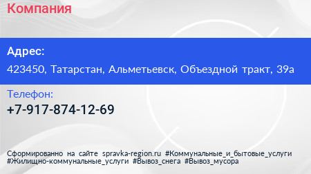 Компания по адресу 423450, Татарстан, Альметьевск, Объездной тракт, 39а в дальнейшем Организация, размещена в следующих категориях: