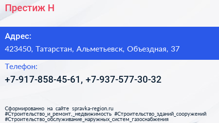 Престиж-Н по адресу 423450, Татарстан, Альметьевск, Объездная, 37 в дальнейшем Организация, размещена в следующих категориях: