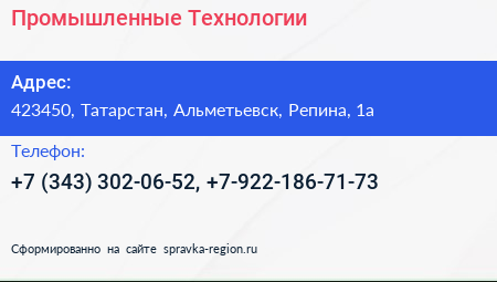 Промышленные Технологии по адресу 423450, Татарстан, Альметьевск, Репина, 1а в дальнейшем Организация, размещена в следующих категориях: