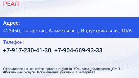 РЕАЛ по адресу 423450, Татарстан, Альметьевск, Индустриальная, 10/6 в дальнейшем Организация, размещена в следующих категориях: