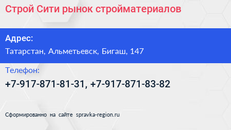 Строй Сити, рынок стройматериалов по адресу Татарстан, Альметьевск, Бигаш, 147 в дальнейшем Организация, размещена в следующих категориях: