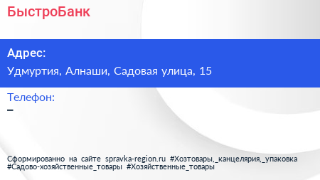 БыстроБанк по адресу Удмуртия, Алнаши, Садовая улица, 15 в дальнейшем Организация, размещена в следующих категориях: