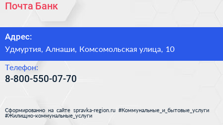 Почта Банк по адресу Удмуртия, Алнаши, Комсомольская улица, 10 в дальнейшем Организация, размещена в следующих категориях: