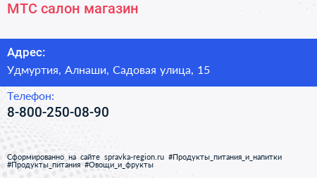 МТС, салон-магазин по адресу Удмуртия, Алнаши, Садовая улица, 15 в дальнейшем Организация, размещена в следующих категориях: