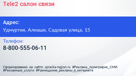 Tele2, салон связи по адресу Удмуртия, Алнаши, Садовая улица, 15 в дальнейшем Организация, размещена в следующих категориях: