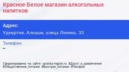 Красное & Белое, магазин алкогольных напитков по адресу Удмуртия, Алнаши, улица Ленина, 33 в дальнейшем Организация, размещена в следующих категориях: