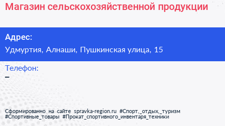 Магазин сельскохозяйственной продукции по адресу Удмуртия, Алнаши, Пушкинская улица, 15 в дальнейшем Организация, размещена в следующих категориях: