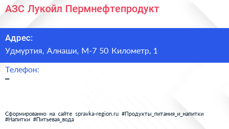АЗС, Лукойл-Пермнефтепродукт по адресу Удмуртия, Алнаши, М-7 50 Километр, 1 в дальнейшем Организация, размещена в следующих категориях: