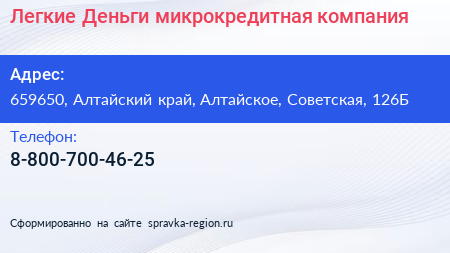 Легкие Деньги, микрокредитная компания по адресу 659650, Алтайский край, Алтайское, Советская, 126Б в дальнейшем Организация, размещена в следующих категориях: