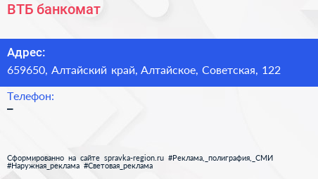 ВТБ, банкомат по адресу 659650, Алтайский край, Алтайское, Советская, 122 в дальнейшем Организация, размещена в следующих категориях: