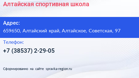 Алтайская спортивная школа по адресу 659650, Алтайский край, Алтайское, Советская, 97 в дальнейшем Организация, размещена в следующих категориях: