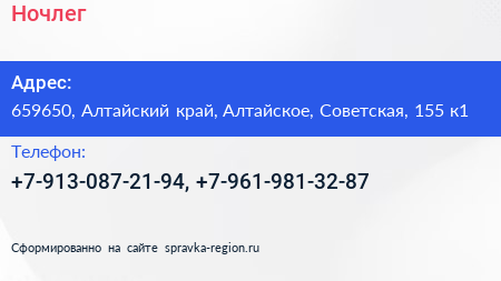 Ночлег по адресу 659650, Алтайский край, Алтайское, Советская, 155 к1 в дальнейшем Организация, размещена в следующих категориях: