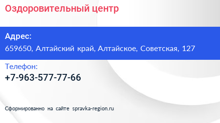 Оздоровительный центр по адресу 659650, Алтайский край, Алтайское, Советская, 127 в дальнейшем Организация, размещена в следующих категориях: