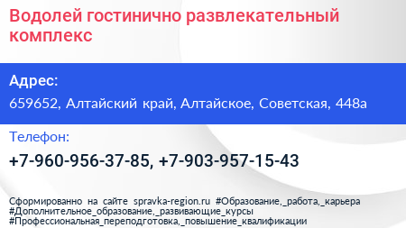 Водолей, гостинично-развлекательный комплекс по адресу 659652, Алтайский край, Алтайское, Советская, 448а в дальнейшем Организация, размещена в следующих категориях: