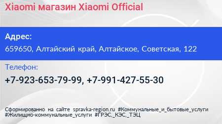 Xiaomi, магазин Xiaomi Official по адресу 659650, Алтайский край, Алтайское, Советская, 122 в дальнейшем Организация, размещена в следующих категориях: