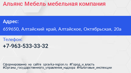 Альянс Мебель, мебельная компания по адресу 659650, Алтайский край, Алтайское, Октябрьская, 20а в дальнейшем Организация, размещена в следующих категориях: