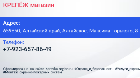 КРЕПЁЖ, магазин по адресу 659650, Алтайский край, Алтайское, Максима Горького, 8 в дальнейшем Организация, размещена в следующих категориях: