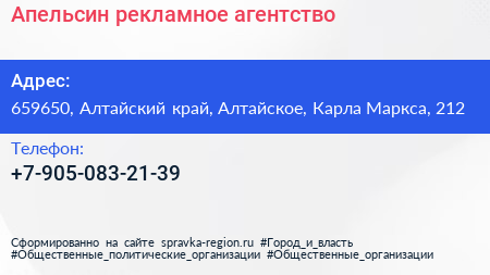 Апельсин, рекламное агентство по адресу 659650, Алтайский край, Алтайское, Карла Маркса, 212 в дальнейшем Организация, размещена в следующих категориях: