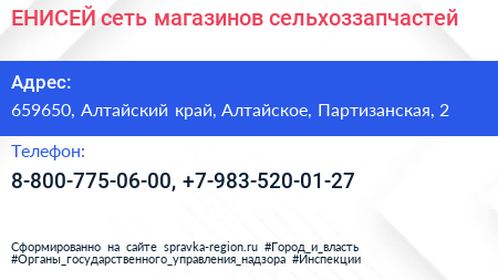 ЕНИСЕЙ, сеть магазинов сельхоззапчастей по адресу 659650, Алтайский край, Алтайское, Партизанская, 2 в дальнейшем Организация, размещена в следующих категориях: