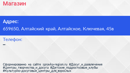 Магазин по адресу 659650, Алтайский край, Алтайское, Ключевая, 45в в дальнейшем Организация, размещена в следующих категориях: