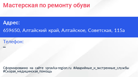 Мастерская по ремонту обуви по адресу 659650, Алтайский край, Алтайское, Советская, 115а в дальнейшем Организация, размещена в следующих категориях:
