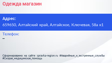 Одежда, магазин по адресу 659650, Алтайский край, Алтайское, Ключевая, 58а к1 в дальнейшем Организация, размещена в следующих категориях: