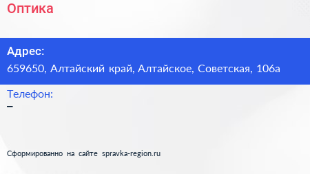 Оптика по адресу 659650, Алтайский край, Алтайское, Советская, 106а в дальнейшем Организация, размещена в следующих категориях: