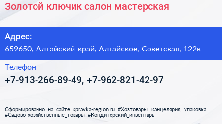 Золотой ключик, салон-мастерская по адресу 659650, Алтайский край, Алтайское, Советская, 122в в дальнейшем Организация, размещена в следующих категориях: