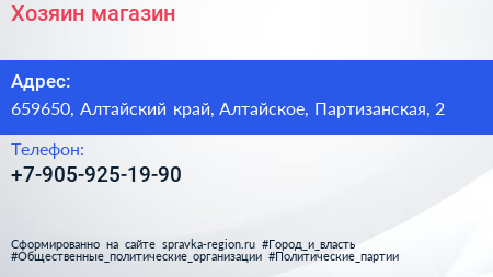 Хозяин, магазин по адресу 659650, Алтайский край, Алтайское, Партизанская, 2 в дальнейшем Организация, размещена в следующих категориях:
