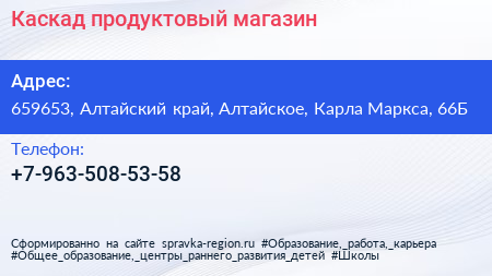 Каскад, продуктовый магазин по адресу 659653, Алтайский край, Алтайское, Карла Маркса, 66Б в дальнейшем Организация, размещена в следующих категориях: