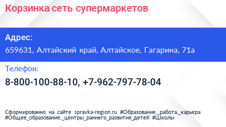 Корзинка, сеть супермаркетов по адресу 659631, Алтайский край, Алтайское, Гагарина, 71а в дальнейшем Организация, размещена в следующих категориях:
