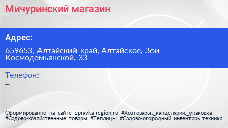 Мичуринский, магазин по адресу 659653, Алтайский край, Алтайское, Зои Космодемьянской, 33 в дальнейшем Организация, размещена в следующих категориях: