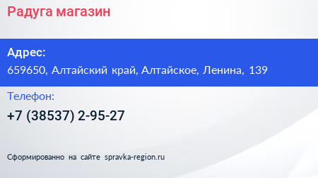 Радуга, магазин по адресу 659650, Алтайский край, Алтайское, Ленина, 139 в дальнейшем Организация, размещена в следующих категориях: