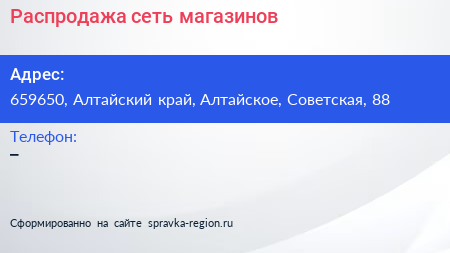 Распродажа, сеть магазинов по адресу 659650, Алтайский край, Алтайское, Советская, 88 в дальнейшем Организация, размещена в следующих категориях: