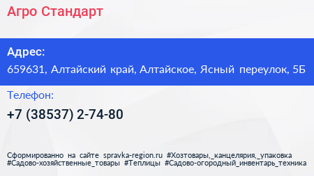 Агро-Стандарт по адресу 659631, Алтайский край, Алтайское, Ясный переулок, 5Б в дальнейшем Организация, размещена в следующих категориях:
