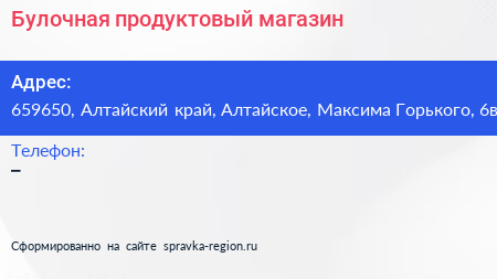 Булочная, продуктовый магазин по адресу 659650, Алтайский край, Алтайское, Максима Горького, 6в в дальнейшем Организация, размещена в следующих категориях: