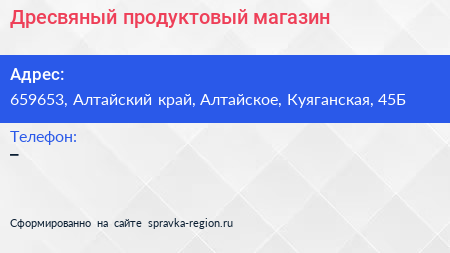 Дресвяный, продуктовый магазин по адресу 659653, Алтайский край, Алтайское, Куяганская, 45Б в дальнейшем Организация, размещена в следующих категориях: