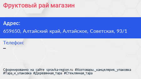 Фруктовый рай, магазин по адресу 659650, Алтайский край, Алтайское, Советская, 93/1 в дальнейшем Организация, размещена в следующих категориях: