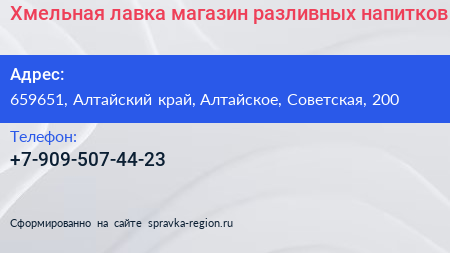 Хмельная лавка, магазин разливных напитков по адресу 659651, Алтайский край, Алтайское, Советская, 200 в дальнейшем Организация, размещена в следующих категориях: