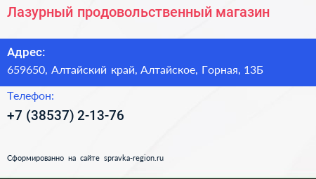 Лазурный, продовольственный магазин по адресу 659650, Алтайский край, Алтайское, Горная, 13Б в дальнейшем Организация, размещена в следующих категориях: