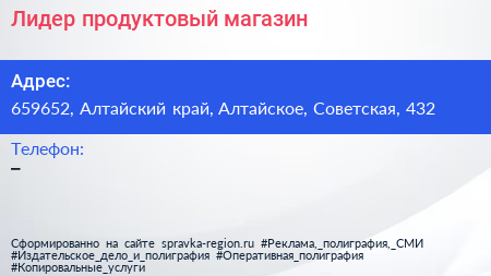 Лидер, продуктовый магазин по адресу 659652, Алтайский край, Алтайское, Советская, 432 в дальнейшем Организация, размещена в следующих категориях: