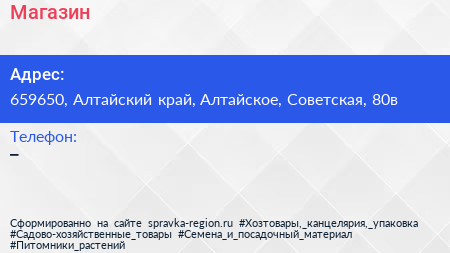 Магазин по адресу 659650, Алтайский край, Алтайское, Советская, 80в в дальнейшем Организация, размещена в следующих категориях: