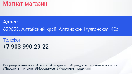 Магнат, магазин по адресу 659653, Алтайский край, Алтайское, Куяганская, 40а в дальнейшем Организация, размещена в следующих категориях: