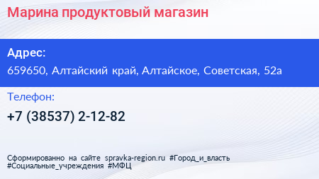 Марина, продуктовый магазин по адресу 659650, Алтайский край, Алтайское, Советская, 52а в дальнейшем Организация, размещена в следующих категориях: