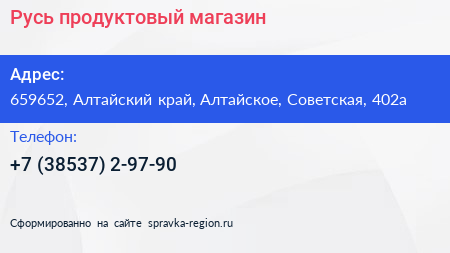 Русь, продуктовый магазин по адресу 659652, Алтайский край, Алтайское, Советская, 402а в дальнейшем Организация, размещена в следующих категориях: