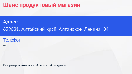 Шанс, продуктовый магазин по адресу 659631, Алтайский край, Алтайское, Ленина, 84 в дальнейшем Организация, размещена в следующих категориях: