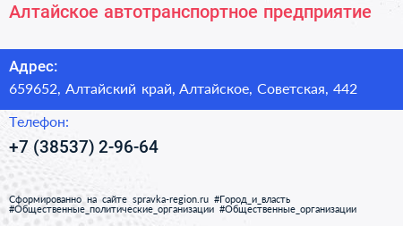 Алтайское, автотранспортное предприятие по адресу 659652, Алтайский край, Алтайское, Советская, 442 в дальнейшем Организация, размещена в следующих категориях: