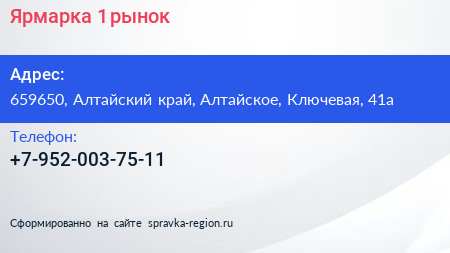 Ярмарка-1, рынок по адресу 659650, Алтайский край, Алтайское, Ключевая, 41а в дальнейшем Организация, размещена в следующих категориях: