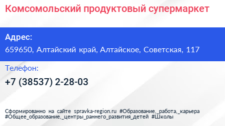 Комсомольский, продуктовый супермаркет по адресу 659650, Алтайский край, Алтайское, Советская, 117 в дальнейшем Организация, размещена в следующих категориях: