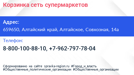 Корзинка, сеть супермаркетов по адресу 659650, Алтайский край, Алтайское, Совхозная, 14а в дальнейшем Организация, размещена в следующих категориях: